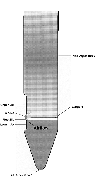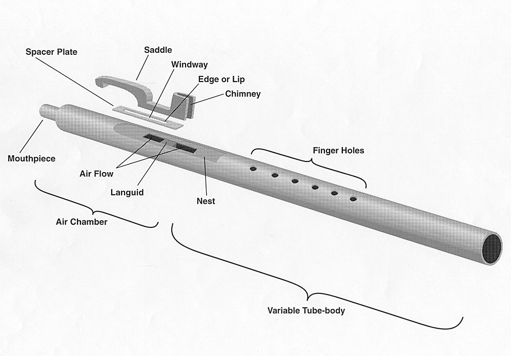 The Native American flute bears a remarkable resemblance to certain features of the organ pipe. Some pipe organs have as many as 10,000 pipes but if we compare a single pipe from the organ with the Native American flute, similarities are obvious. The organ pipe consists of an air entry hole penetrating into the foot. The pipe foot and body are separated by a thin sheet of metal, the "languid". Air flows over the "languid", at the flue slit and into the pipe body where a combination of air column oscillations and an air jet over the "languid" produce sound. Now compare a Native American flute. Air is blown into the air chamber through the mouthpiece. A narrow piece of wood extending through the entire internal diameter of the flute, serves as the "languid" and separates completely the anterior air chamber from the more distal variable body or tube. A small area on both sides of the "languid" is flattened (the nest). Air flows out of the proximal chamber window over the "languid" and splits on the edge of a metal or wooden plate. Part of the air flows down through the distal chamber window and into the variable body. Oscillation of air in the variable body along with opening and closing of the finger holes produces the melodic sound typical of this flute. A distinctive "warble" sound, unique to the Native American flute can be produced with careful craftsmanship around the "languid" area. The "saddle" is a descriptor for a piece of wood which is placed over the two chamber windows and the "languid". This is a critical part of the flute for without it the flow of air is chaotic and without sound. Craftspeople use this part of the flute as an opportunity to construct various animal/bird forms thereby adding more "personal medicine" to the instrument. Tonal quality, scale and pitch are influenced by a number of variables including the flute total length, internal diameter, distance of the "languid" from the mouthpiece, distance of the first finger hole from the "languid", finger hole to finger hole distance and finger hole diameter. Any hollow cylinder works, for example metal or plastic, but wood is the most traditional material for the Native American flute. Members of the cedar/juniper species have always been the most common wood source used by Native American craftsmen, but almost any wood can be used. In general, the cedars and junipers seem to result in flutes with the more mellow sounds.