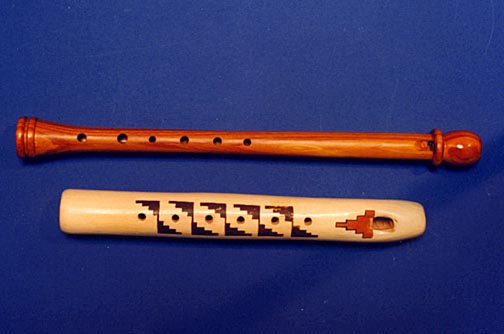 The Native American flute is unique in many ways but perhaps foremost is its design. It is one of the few, if not the only, end-blown and two-chambered flute known. The presence of flute/whistle instruments in the Americas has been documented for approximately 1500 years (there is scant evidence for possible flute making in the Anasazi area as early as 200 BC) but its origin remains obscure. This type of flute belongs to the group of instruments referred to as "flute-a-bec" related to a European style flute of the Middle Ages. Alternatively, it could be considered simply an end-blown fipple flute. In essence this instrument requires a mechanism for changing chaotic air flow to directed air flow in order to produce a sound The human voice perhaps was the first source of primitive music and early wind instruments may have started with a simple whistle providing the early Native American craftsmen a basis for expanding music capability. Additional constructive ideas could have come from another European instrument, the flageolet. Instruments similar to the flageolet have been found in burial sites associated with the BasketMaker period, 500-750 AD. As the Native American flute slowly evolved it probably became increasingly a personal instrument. The more contemporary period of flute-making over the past 150 or so years was characterized by individuality although within some tribal groups, flute-making was a craft limited to certain persons and if one wanted a flute, a bargain had to be made with the flute-maker.